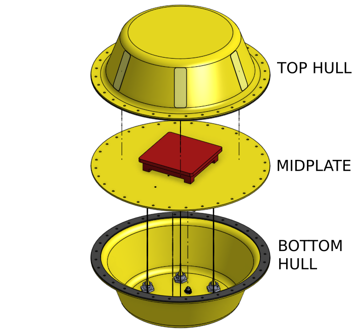 The shape of the buoy will cause it to roll in the waves, which may make maintaining a satellite connection with a directional antenna challenging. In addition, the antenna may need to be mounted on the outside of the upper hull to reduce attenuation from the water. Further discussion with the satellite uplink design team is needed to fully understand the mechanical requirements of the satellite uplink system.