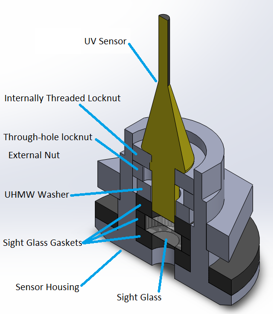 Further discussion with the optics team is required to evaluate the suitability of different sight glass materials. The current design has the sight glass tucked inside the housing to ensure good sealing and protection from outside debris. However, this approach may trap bubbles that interfere with the UV fluorescence measurement. If changing to an acrylic sight is feasible, it will be advantageous to redesign the housing and sight design to mount the sight on the bottom outside surface of the housing to allow bubbles to roll off the glass unobstructed.