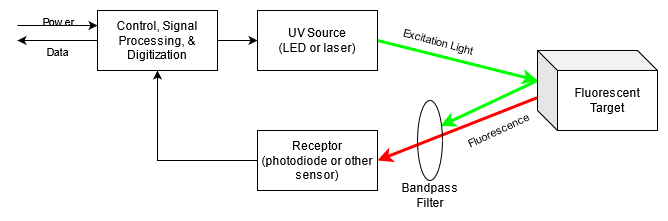 The excitation source must have a tight frequency distribution, so an LED or laser is often used. To detect the emitted fluorescence, a photodiode or other light receptor sensitive in the range of the characteristic frequency is often used. However, the receptor will often also be sensitive to the light frequency from the excitation source, so an optical bandpass filter must be placed in front of the receptor to isolate light at the fluorescence frequency.